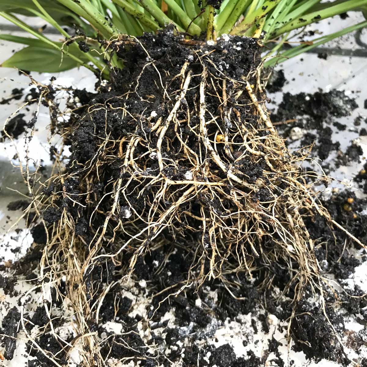 - If you slip the plant out of its pot, the rootball is all in one piece and there doesn't seem to be much soil left.